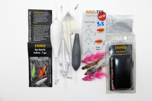 Complete INNO-Bombarda Click pack with INNO Insulator, 4 pcs. INNO CLICK 20-25 Gram with 5 pcs. INNO No Tangel Tube. 4 pieces INNO TFS flies and 5 pcs. INNO Go Get It inline 1 gram plastic lures. Pris 299,00dkr.